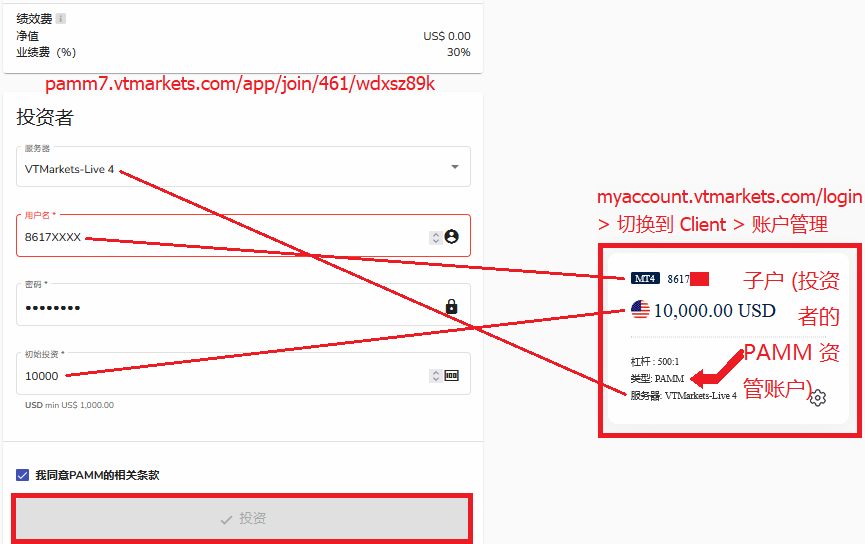 由于在上面的 "步骤 C" 您已经加入了我们的资管,如果您要加额投资 (增加您的投资),您必须使用不同的链接 : pamm7.vtmarkets.com/app/auth/investor 并登录。