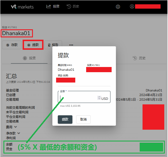 C2) 您将立即被转到 https://pamm7.vtmarkets.com/app/investments/xxxxx 及您将在下方看到余额 = $0.00 和资金 = $0.00。同时,如果您登录 myaccount.vtmarkets.com/login > "账户管理" > "类型" = "PAMM" 的帐户,您应该也会看到金额转换为零 (0.00 美元),这意味着您的资金已 "汇集" 到我们的 PAMM 资管账户内 **,我们,您的资金经理人,将被您委托进行交易。请看下图。